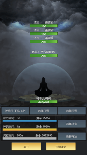 【选择阵法】灰色按钮的作用是挑选阵法来帮你抵御天雷,其效果和渡劫法宝相同,不过每次只能使用一个。需要注意的是,阵法会每秒消耗灵石,所以在自身灵石储备不足时,尽量不要开启阵法。一旦灵石消耗殆尽,哪怕阵法还有剩余血量,也无法再为你扛雷了。