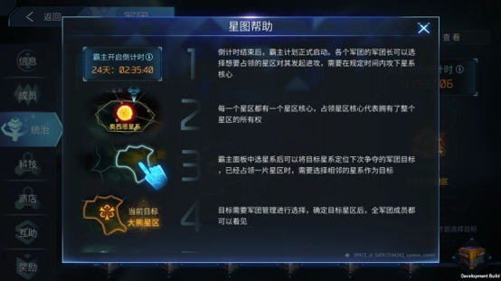 在霸主计划启动前,各位可以在军团界面自由挑选想要进攻的星系;另外,所有星系都会被划分成若干星区。关于这部分的具体内容,军团内的统治界面有详细说明,到时候大家可以自行打开查看~