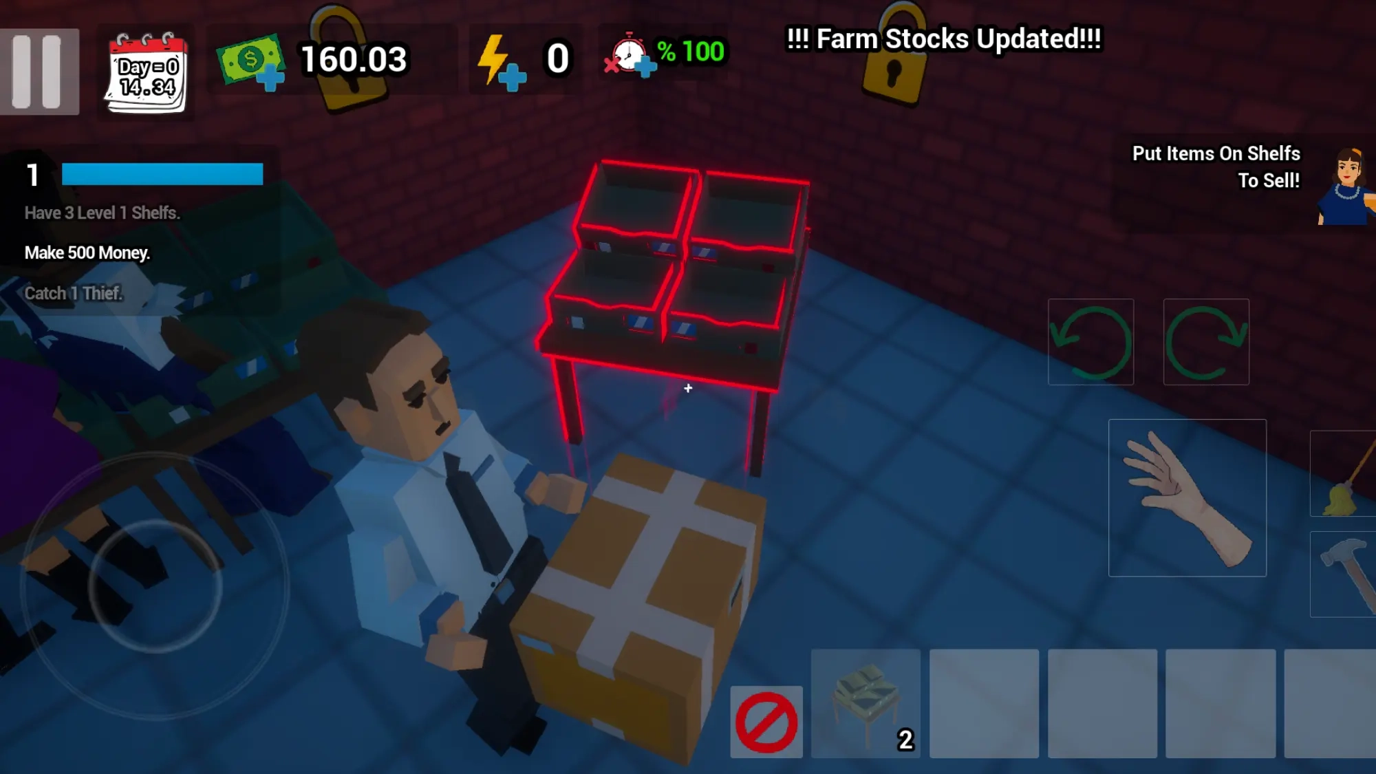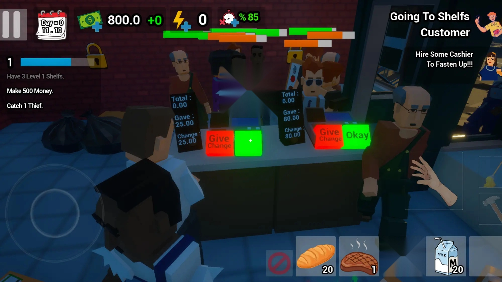 1、解锁各类物品,对店铺和员工进行升级,完成升级后,最终打造出强大的超市。