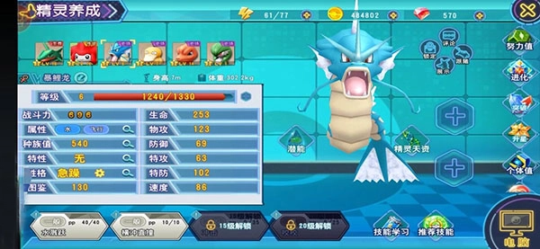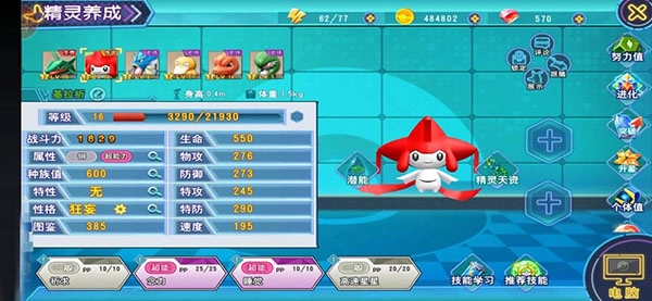推荐技能:龙之舞,能够提升自身的攻击与速度,是增益类技能;龙爪,对敌方造成全额伤害,为进攻型技能;神速,使用后会对敌方发起突击;咬碎(恶属性),攻击敌方的同时,有概率降低其防御。若队伍整体防御能力偏弱,可对烈空坐进行努力值重置,将已分配的潜能点转化为精灵的潜能值,从而显著增强整个队伍的战斗力。